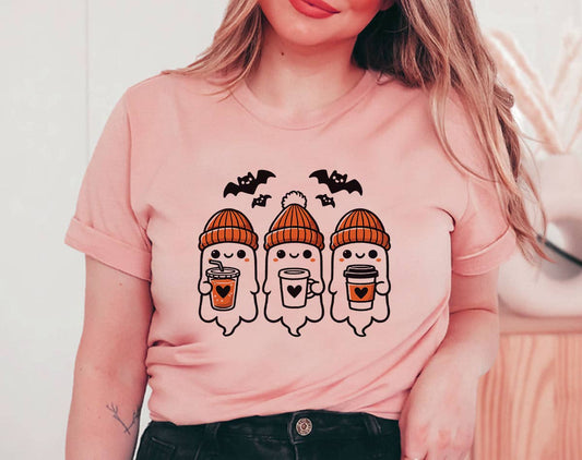 Three Cute Ghost's Drinking Coffee - Halloween T-Shirt