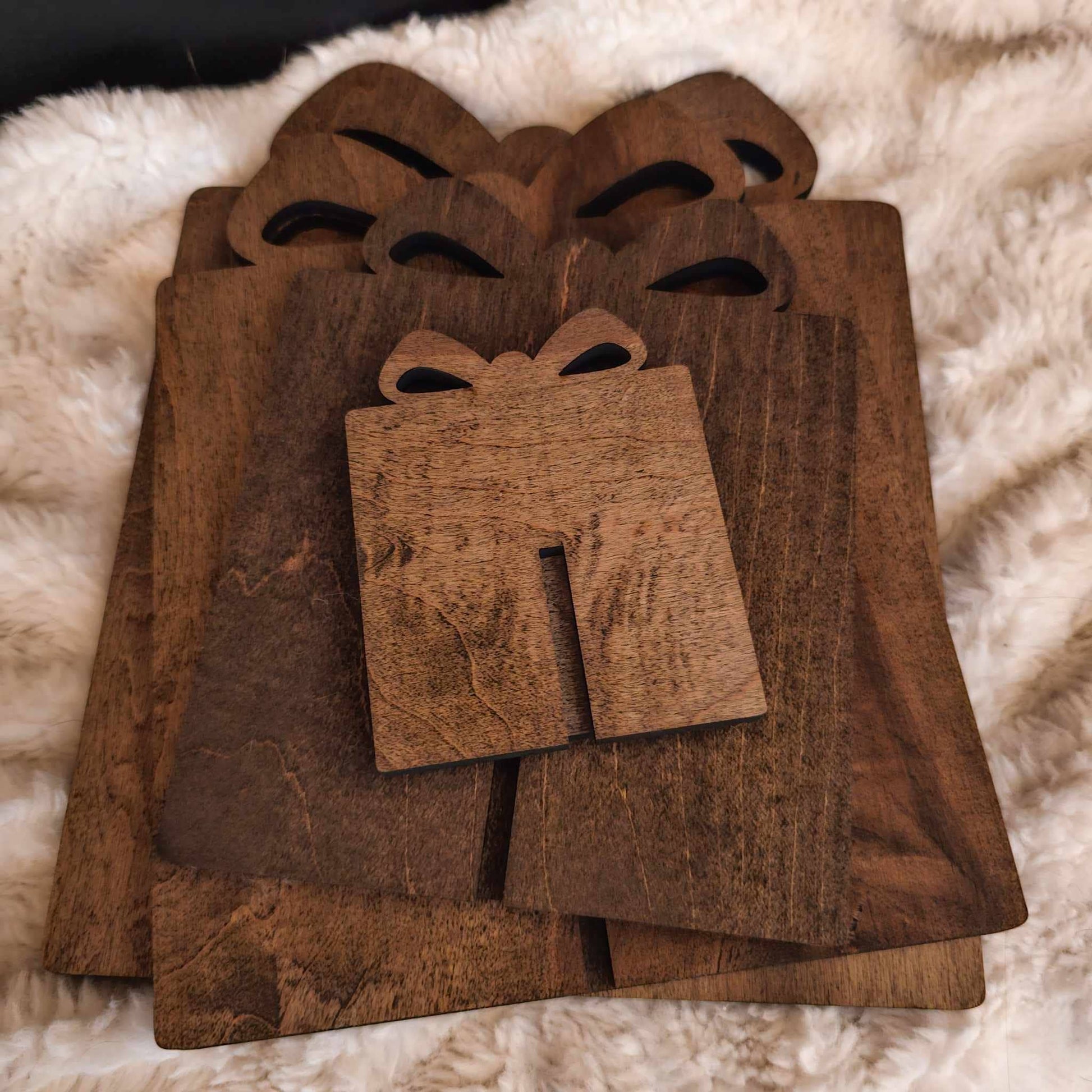 These gifts are cut from 1/4" wood. They are the perfect holiday accent in any style of home decor. Fold flat for easy storage!