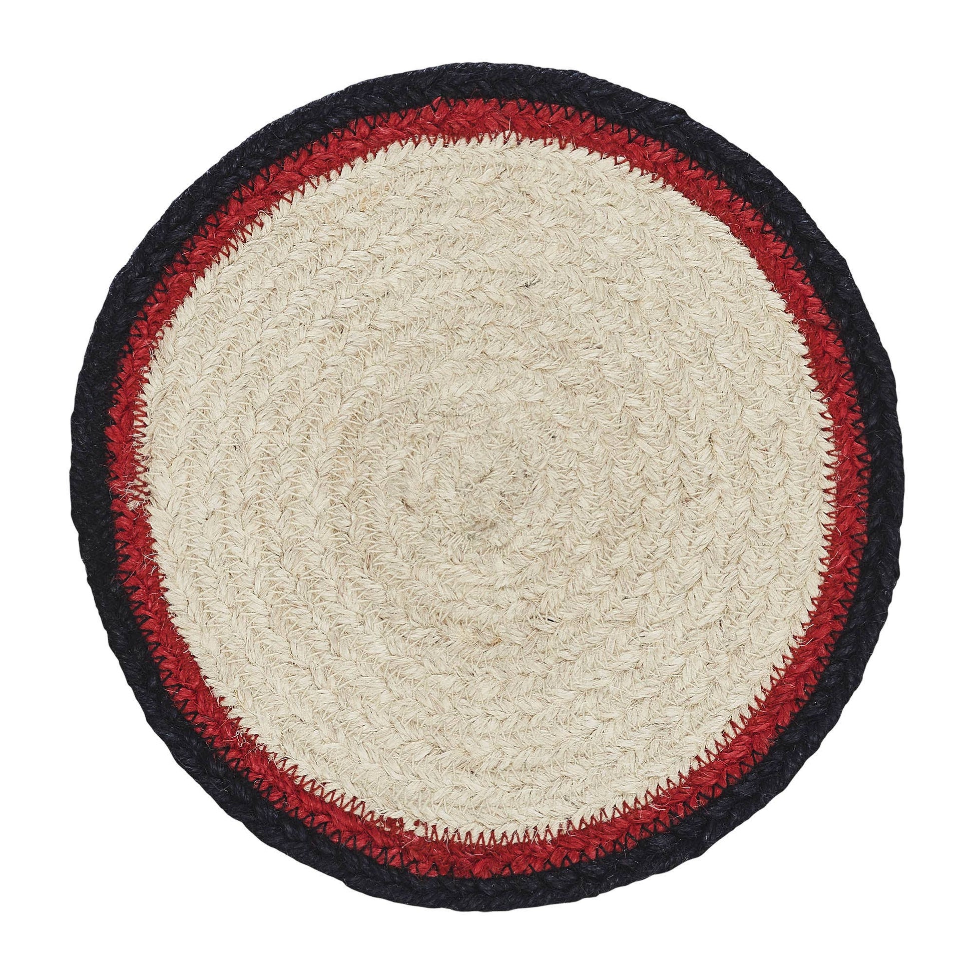 Add a retro pop to your Christmas table decor. The Jolly Ole Santa Braided Jute Trivet includes one circular hot pad measuring 8 inches. A unique blend of jute and recycled cotton are braided to form a deep creme base with a red and black striped edging. The central creme weave is printed with a vintage inspired Santa in distressed red and black. Spot clean as needed. Coordinates with the Jolly Ole Santa Collection by VHC for more festive classic Christmas decor.