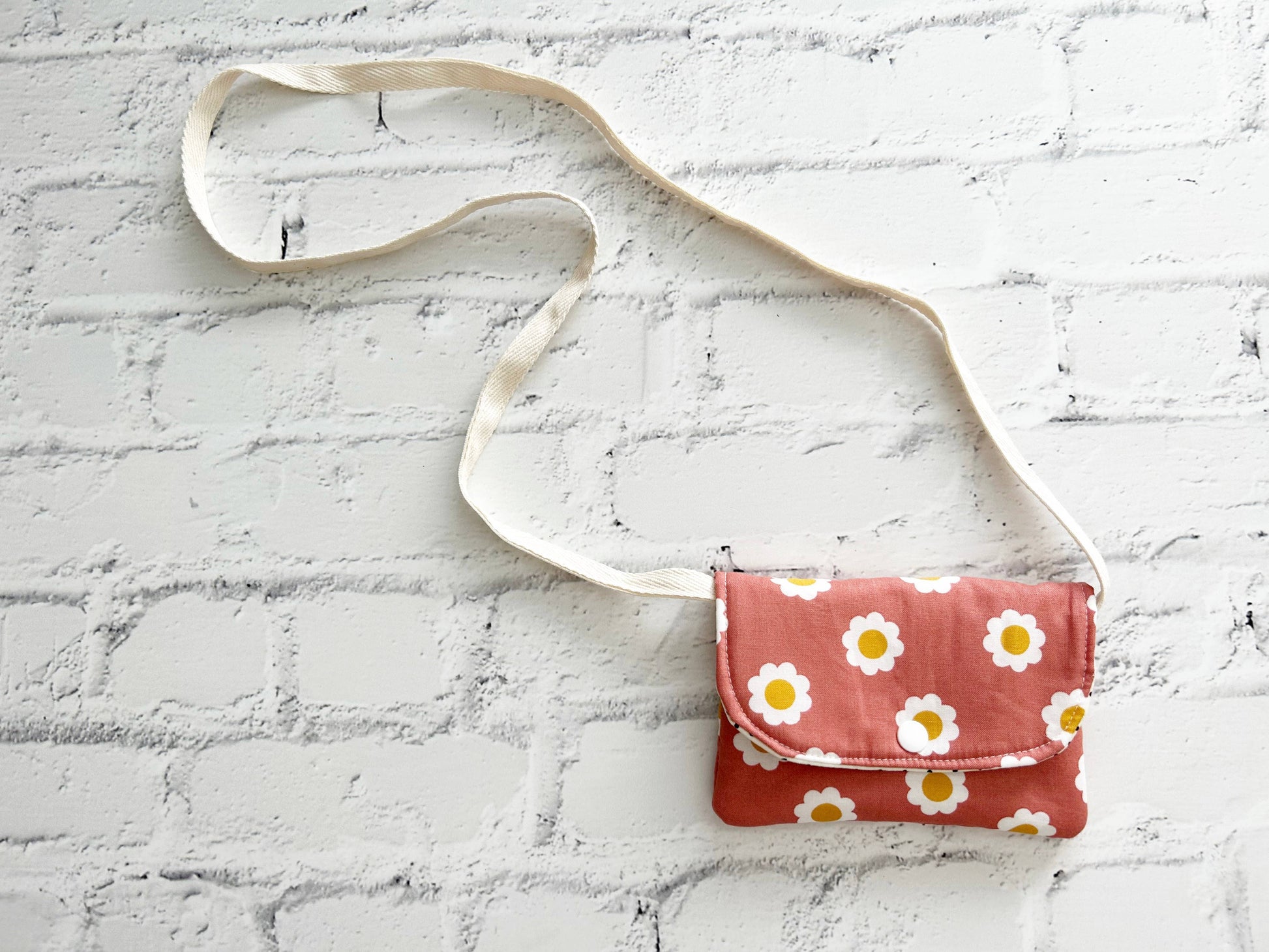 This purse is perfect as a kids purse or toddler crossbody bag. The bag is made with quilting cotton as the exterior and interior of the fabric and has a thick interfacing to make it sturdy by soft. The strap is made from cotton twill and has a strong plastic snap.