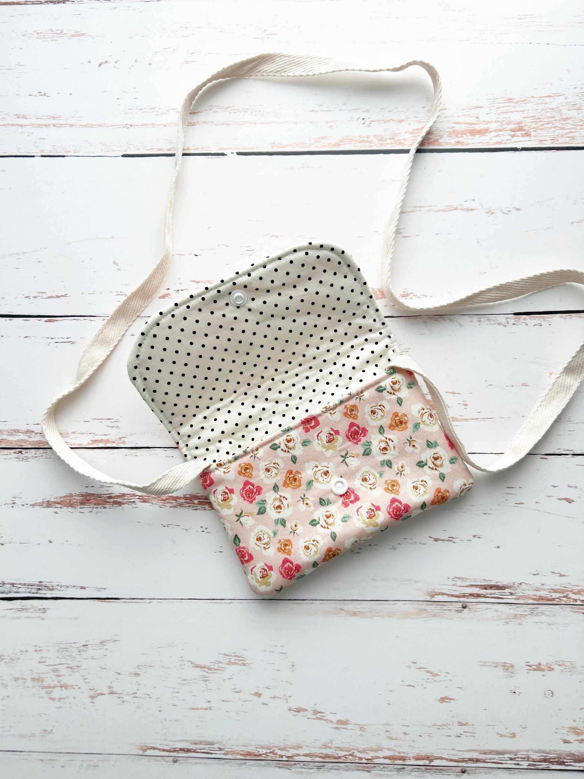 This purse is perfect as a kids purse or toddler crossbody bag. The bag is made with quilting cotton as the exterior and interior of the fabric and has a thick interfacing to make it sturdy by soft. The strap is made from cotton twill and has a strong plastic snap.