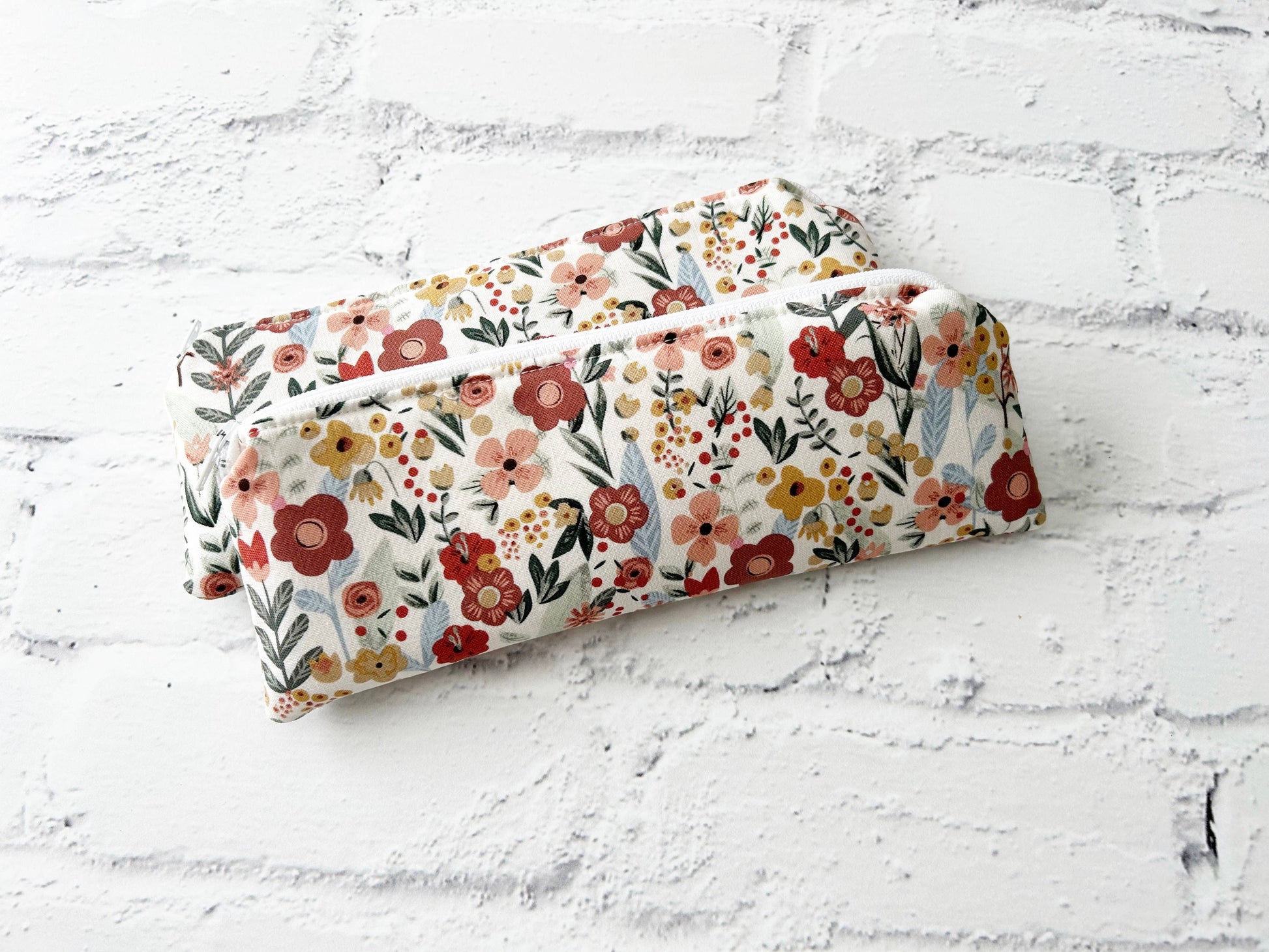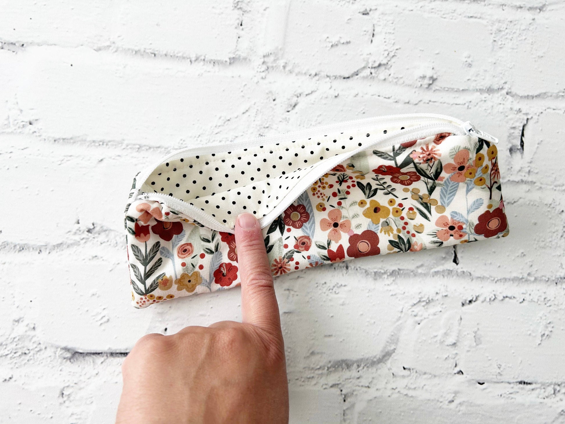 This pouch is approximately 9x3 inches. Made with quilting cotton fabric and lined with polka dot quilting cotton. All pouches are made with white nylon YKK zippers. The exterior quilting cotton has a soft thick interfacing fused to the fabric which makes the pouch a little stiffer and soft.
