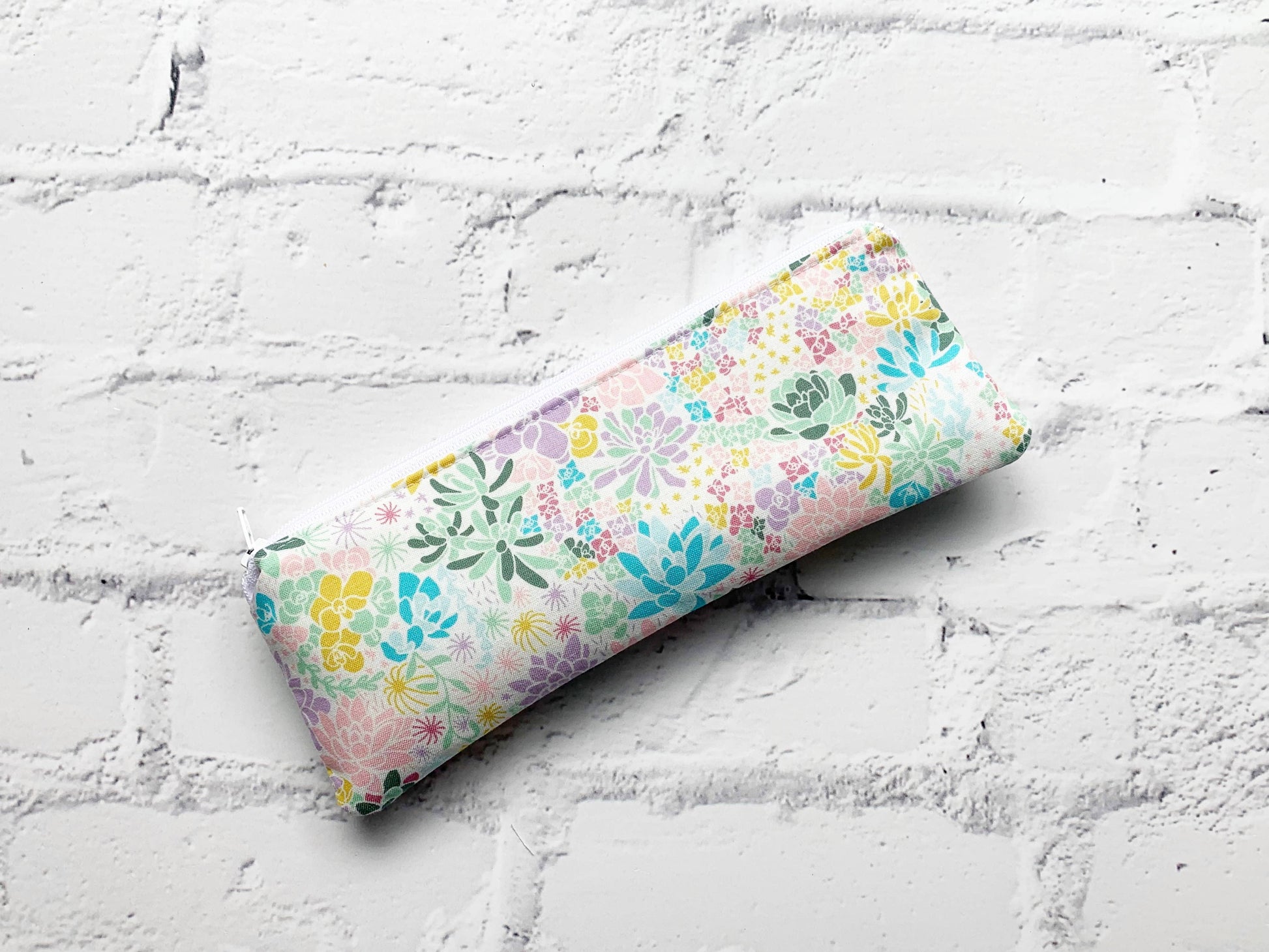 This pouch is approximately 9x3 inches. Made with quilting cotton fabric and lined with polka dot quilting cotton. All pouches are made with white nylon YKK zippers. The exterior quilting cotton has a soft thick interfacing fused to the fabric which makes the pouch a little stiffer and soft.