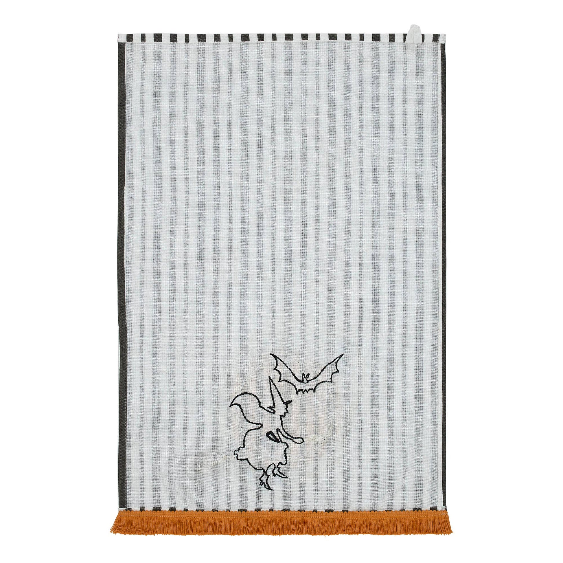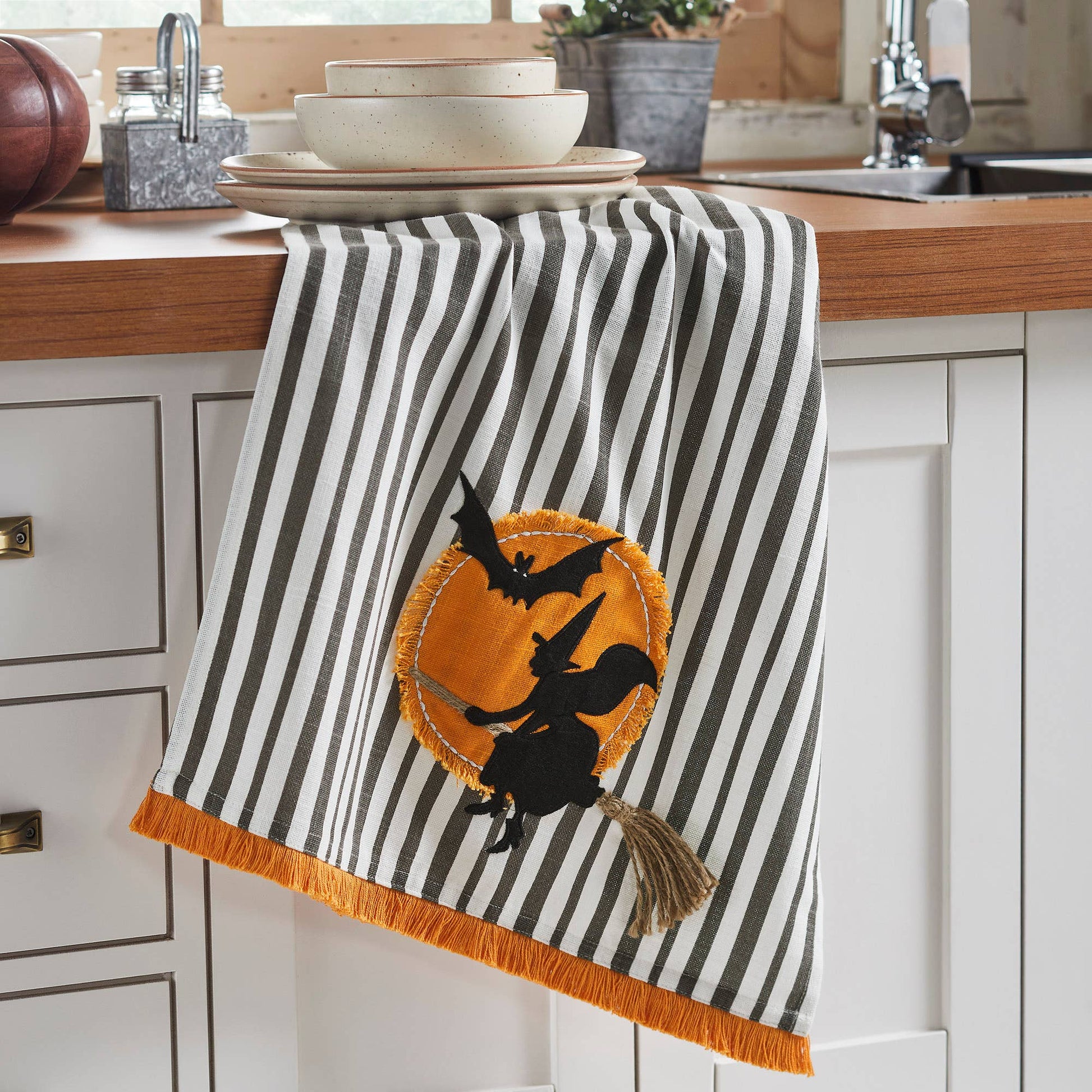 Embrace the enchanting spirit of autumn and Halloween with the VHC Brands Witching Hour Tea Towel, a charming addition to your farmhouse-inspired kitchen. Sized perfectly at 19x28 inches, this durable cotton towel weaves a delightful narrative: a graceful witch on her broom, her silhouette stark against a glowing pumpkin orange moon, with a tiny black bat playfully joining her flight. Each detail whispers rustic charm, from the textural embrace of jute twine adorning her broom to the crisp, comforting grey and white stripes forming the base of this spooky scene. A vibrant splash of orange fringe dances along the edge, instantly brightening your space with a festive, vintage flair, perfect for both everyday practicality and decorative display. Crafted to evoke a cherished, bygone era, this tea towel blends primitive elegance with a captivating Halloween allure. Its palette of deep black, rich pumpkin orange, and soft grey conjures a bold yet warm seasonal display, making it an ideal accent for your country kit